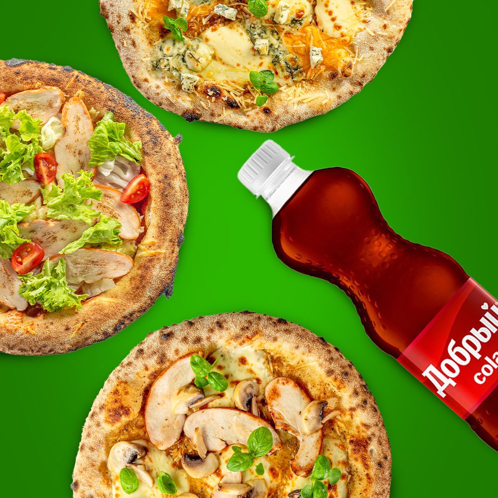 Курица и грибы (26 см) 4 сыра (26 см) Цезарь (26 см) Добрый Кола 1л