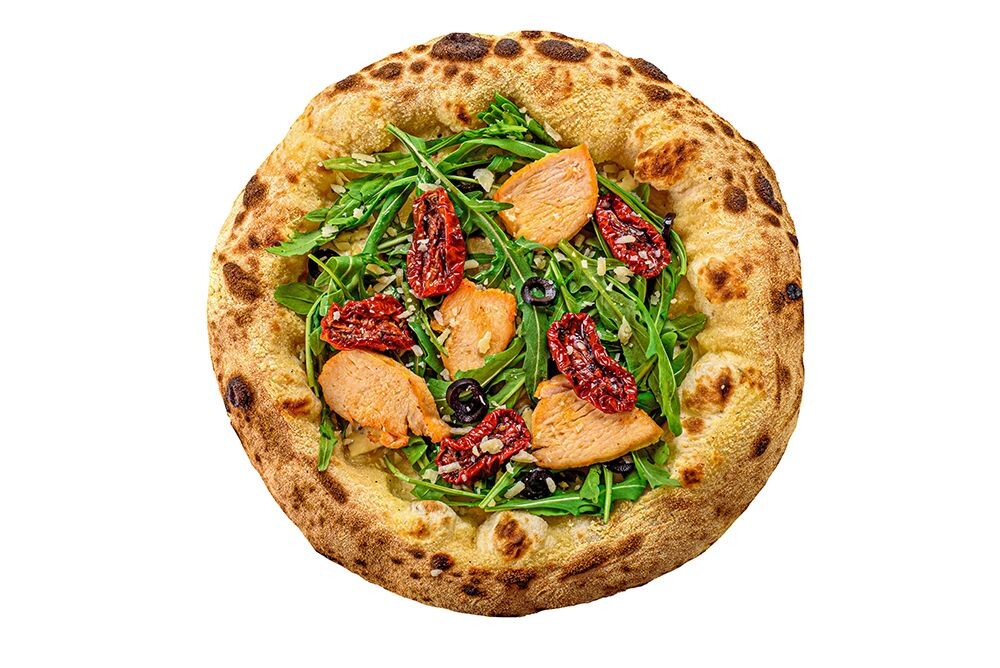 Руккола, вяленые томаты, маслины, филе запеченное, моцарелла, соус томатный.