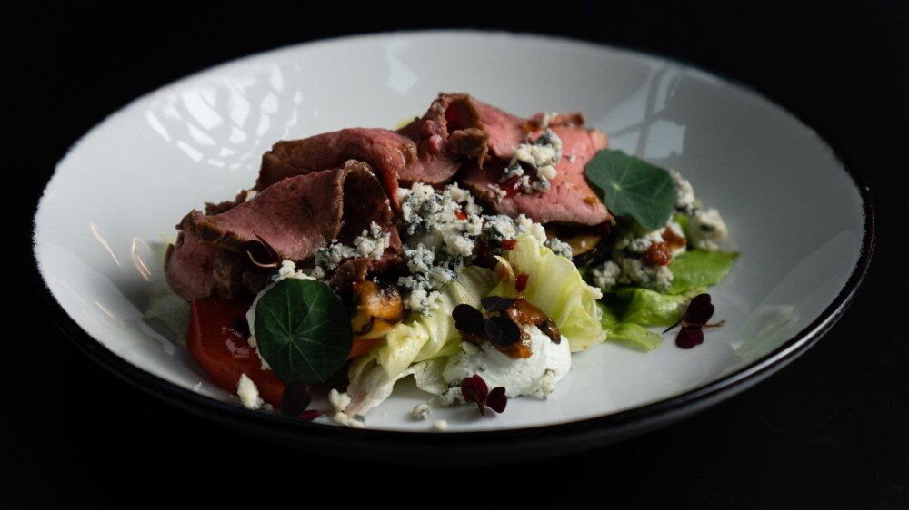 Ростбиф из фермерской телятины, дор блю, мусс дор блю, овощи,ромен