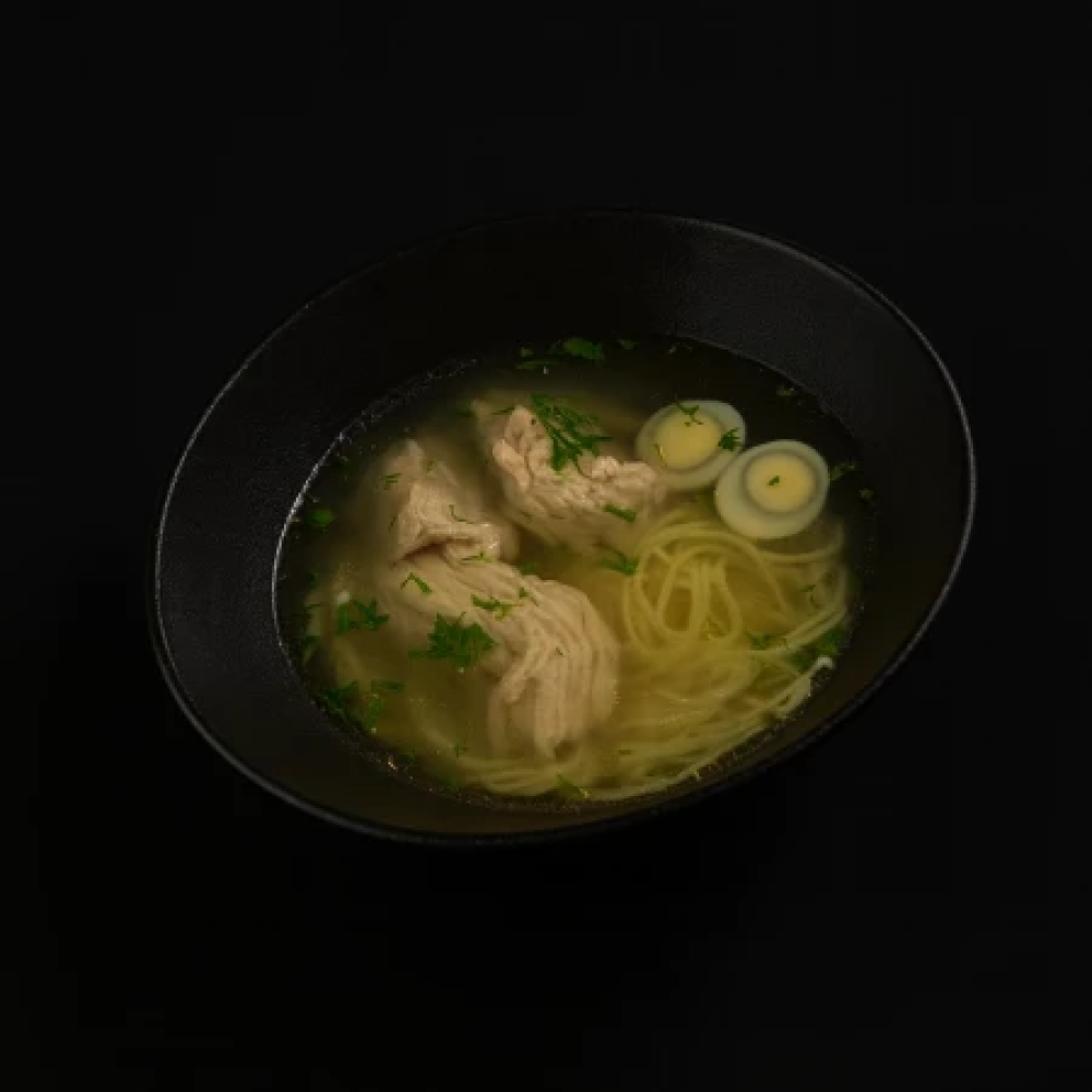 Ароматный куриный бульон, яичная лапша, перепелиные яйца, куриное филе, зелень.