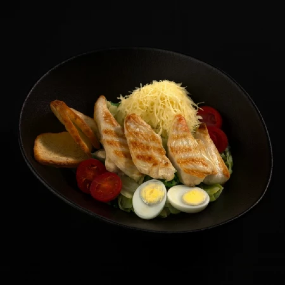 Микс зелени, салат "Айсберг", томаты черри, яйца перепелиные, сухарики, пармезан, соус фирменный, куриное филе.