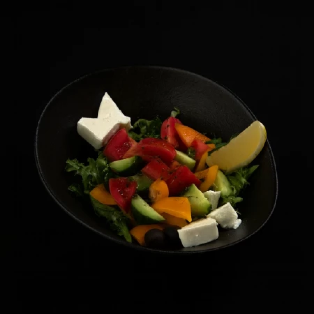 Микс зелени, помидор, огурец, болгарский перец, лук ялтинский, сыр фета, маслины, фирменная заправка на основе оливкового масла, прованские травы, лимон.