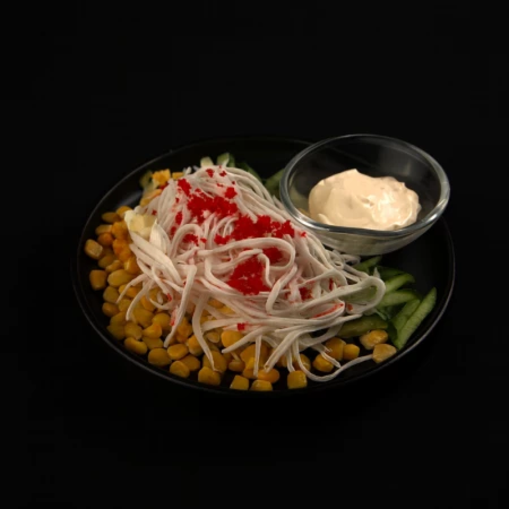 Снежный краб, огурец, яйцо, кукуруза, майонез, икра масага.