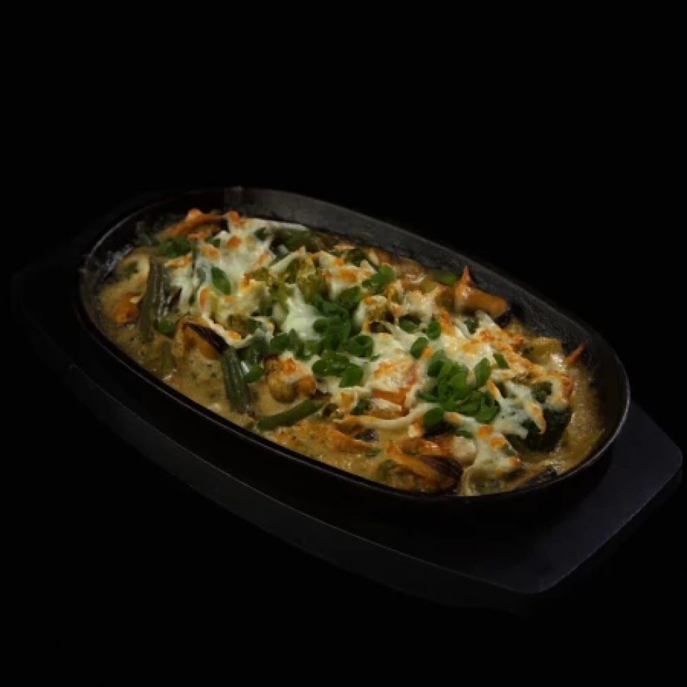 Мидии, лук репчатый, брокколи, стручковая фасоль, сливки, сыр, чесночная нотка, зелень.