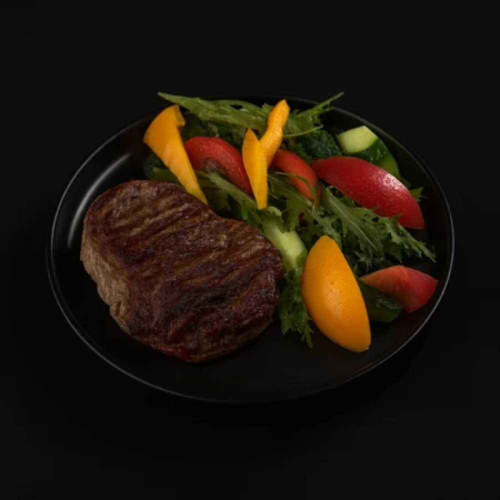 Говяжий стейк с овощным салатом из огурца, томатов черри, болгарского перца, зелени "Айсберга" и ялтинского лука.