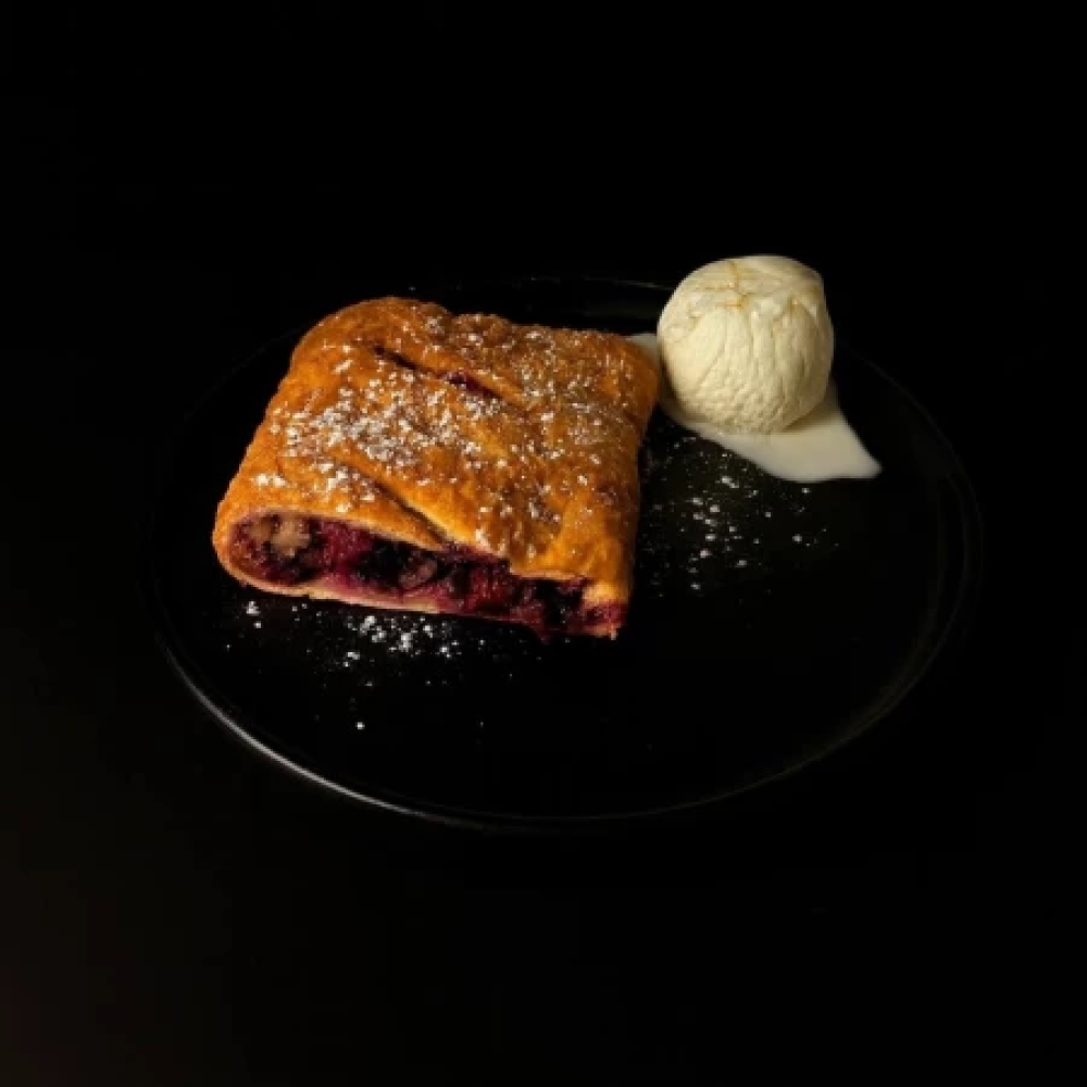 Штрудель из слоеного теста. Ягодный (ягоды вышни, клубники, малины, изюм, грецкие орехи). Яблочный (Яблоки, корица, изюм, грецкие орехи).