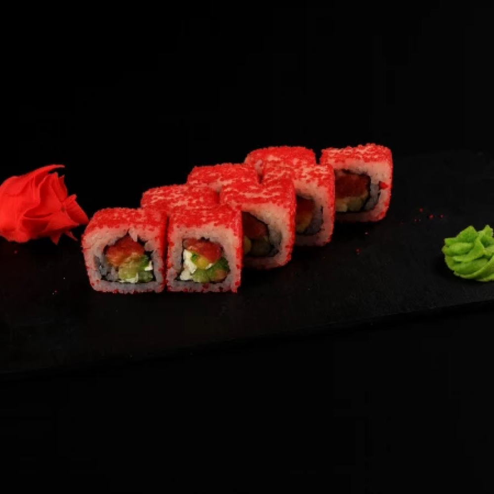 Рис, огурец, икра масага, авокадо, сыр сливочный, лосось.