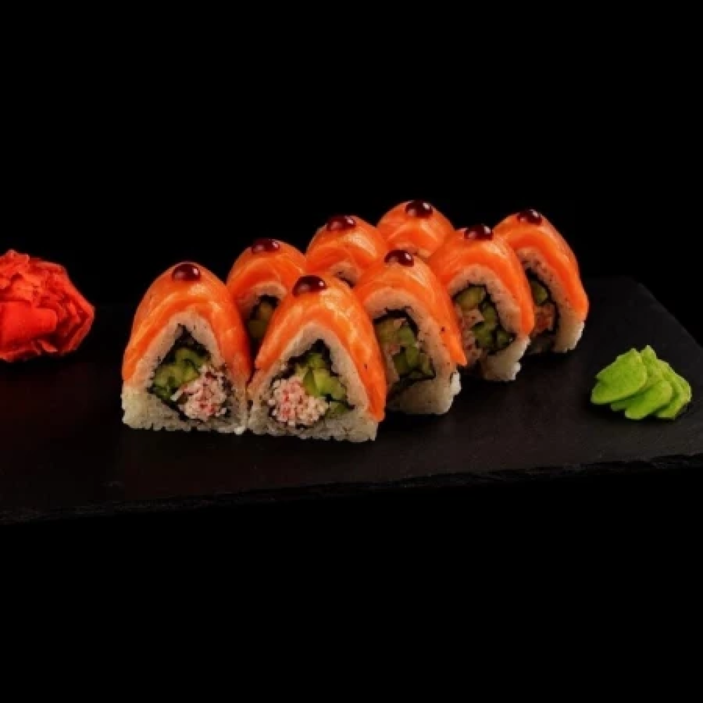 Рис, спайси краб, огурец, авокадо, икра масага, лосось, тунец, устричный соус.