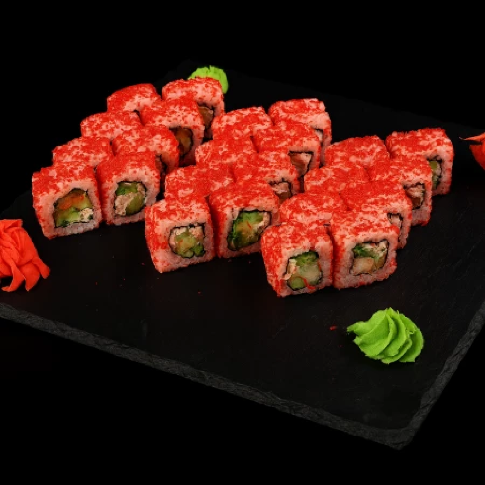 Калифорния с креветкой, калифорния с лососем, калифорния с ургём.