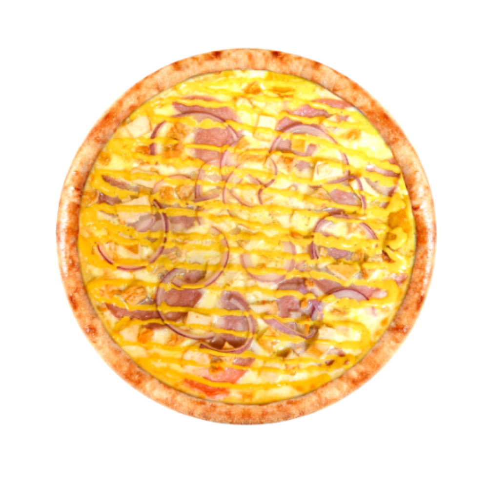 Сыр моцарелла, курица, ветчина, красный лук, сливки, соус карри