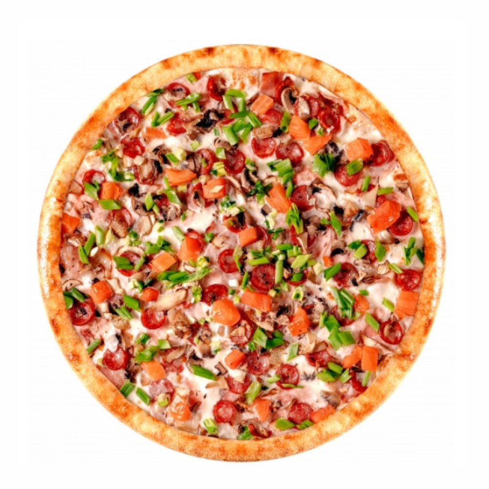 Сыр моцарелла,Сливки 33%,Бекон,Ветчина,Колбаски охотничьи,Помидоры,Шампиньоны,Лук зеленый.