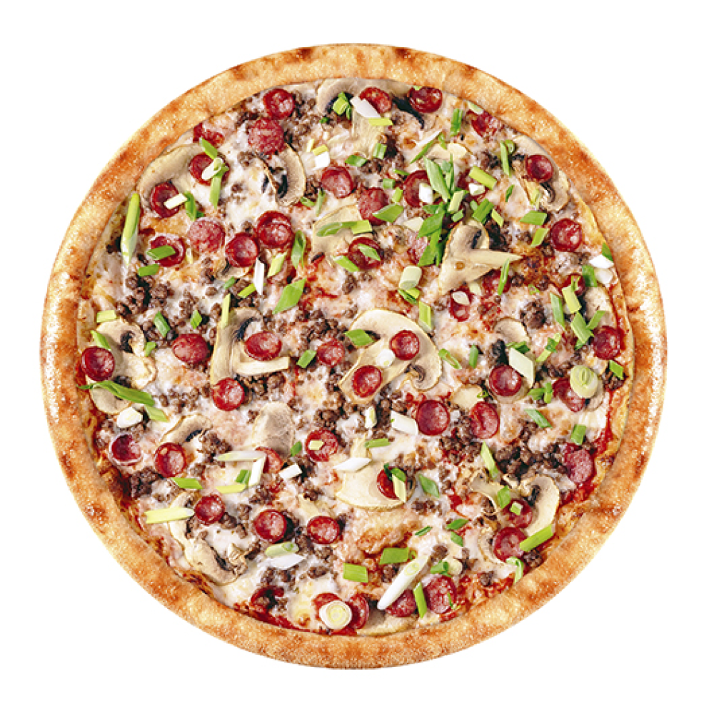 Томатный соус, сыр моцарелла, Говядина, колбаски охотничьи, шампиньоны, зеленый лук
