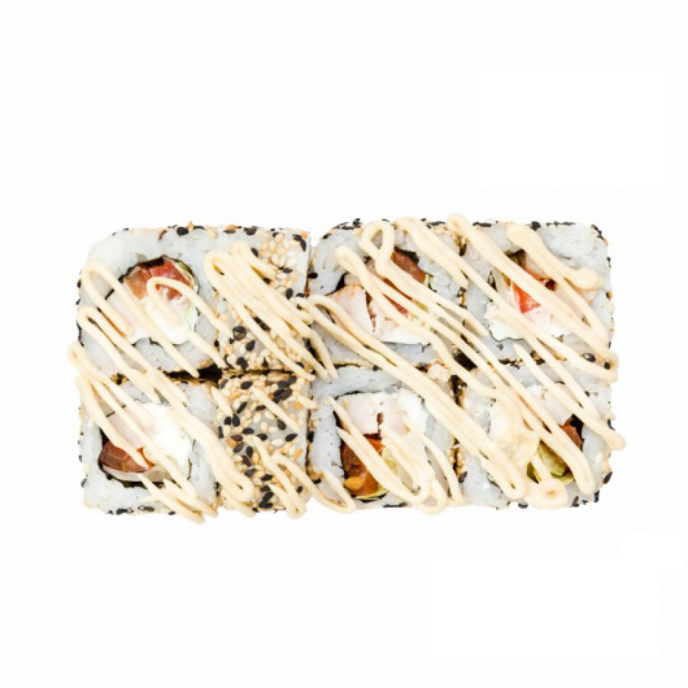 нори, рис, сыр творожный, курица, помидор, салат Айсберг, кунжутный микс, соус Цезарь.