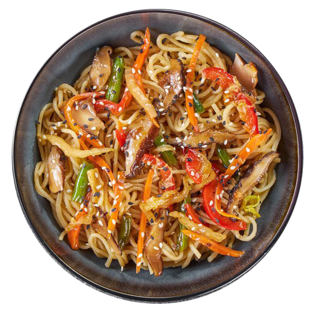 Лапша Логманная,Шампиньены,Перец болгарский ,Морковь,Пекинская капуста,Фасоль стручковая,Лук репчатый,Смесь Кунжута,Соус терияки,Масло кунжутное,Цукини,Соевый Соус,Лук зеленый.
