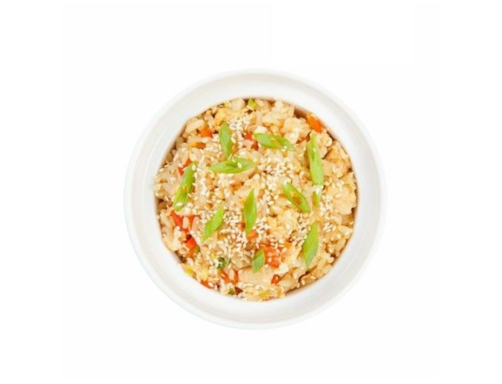 Рис, масло кунжутное, лук зеленый, перец болгарский, яйцо куриное, лосось, соевый соус, кунжут