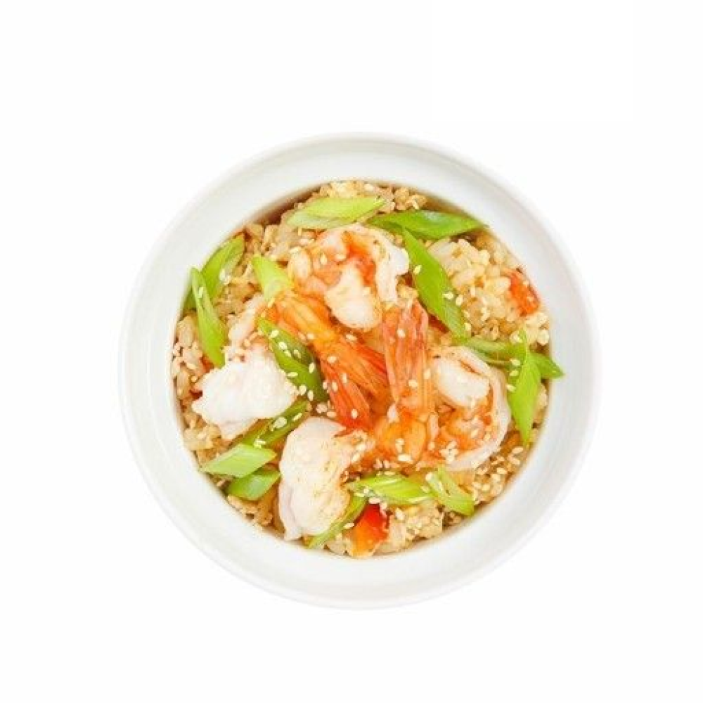 Рис, масло кунжутное, лук зеленый, перец болгарский, яйцо куриное, креветка, соевый соус, кунжут.