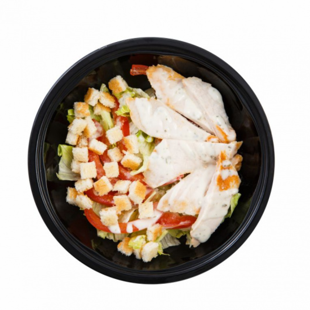 Салат Айсберг ,Курица ,Соус Цезарь ,Помидоры свежие,Сухарики,Пармезан.