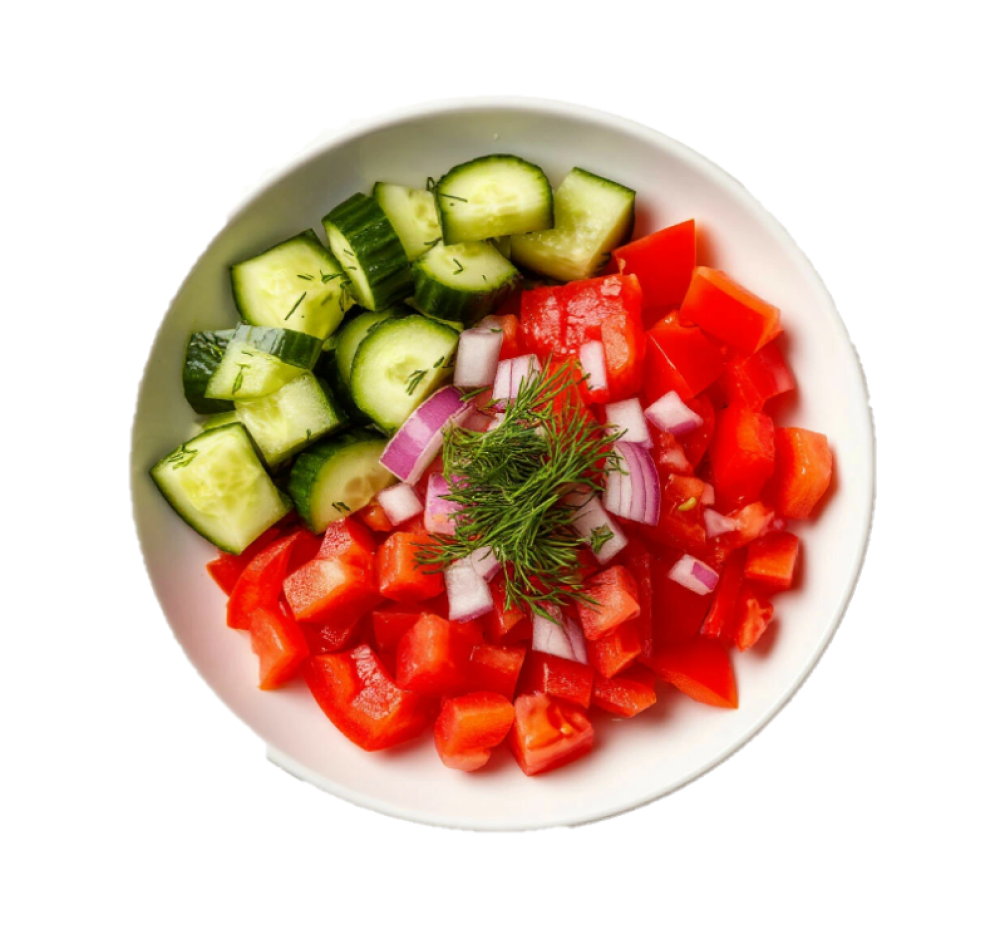 Огурец,Помидор,Перец болгарский,Лук красный,Масло оливковое,Соевый соус,Кинза,Укроп,Чеснок,Соль.