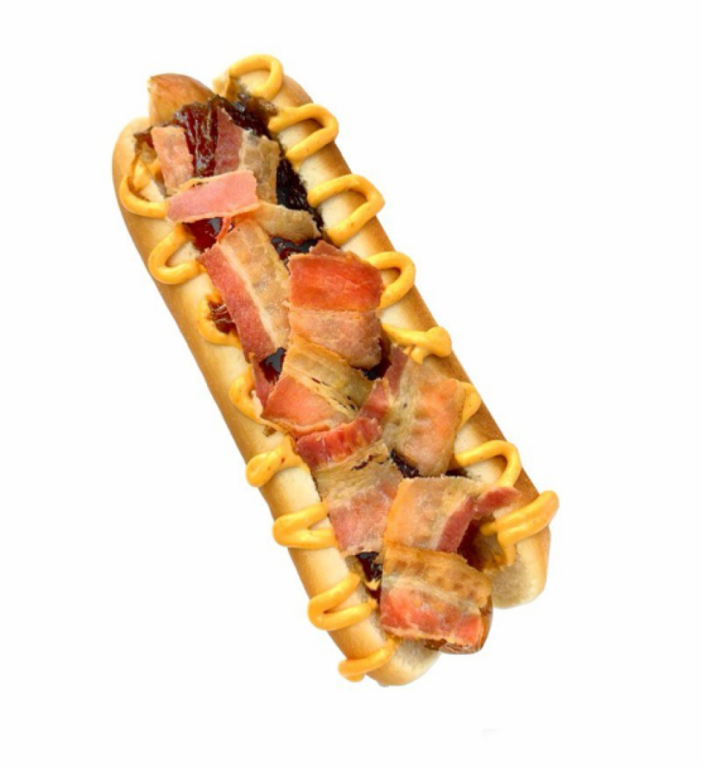 Булка для хот-дога,Сосиска Говяжья,Соус Спайси,Луковое варенье,Жареный бекон.