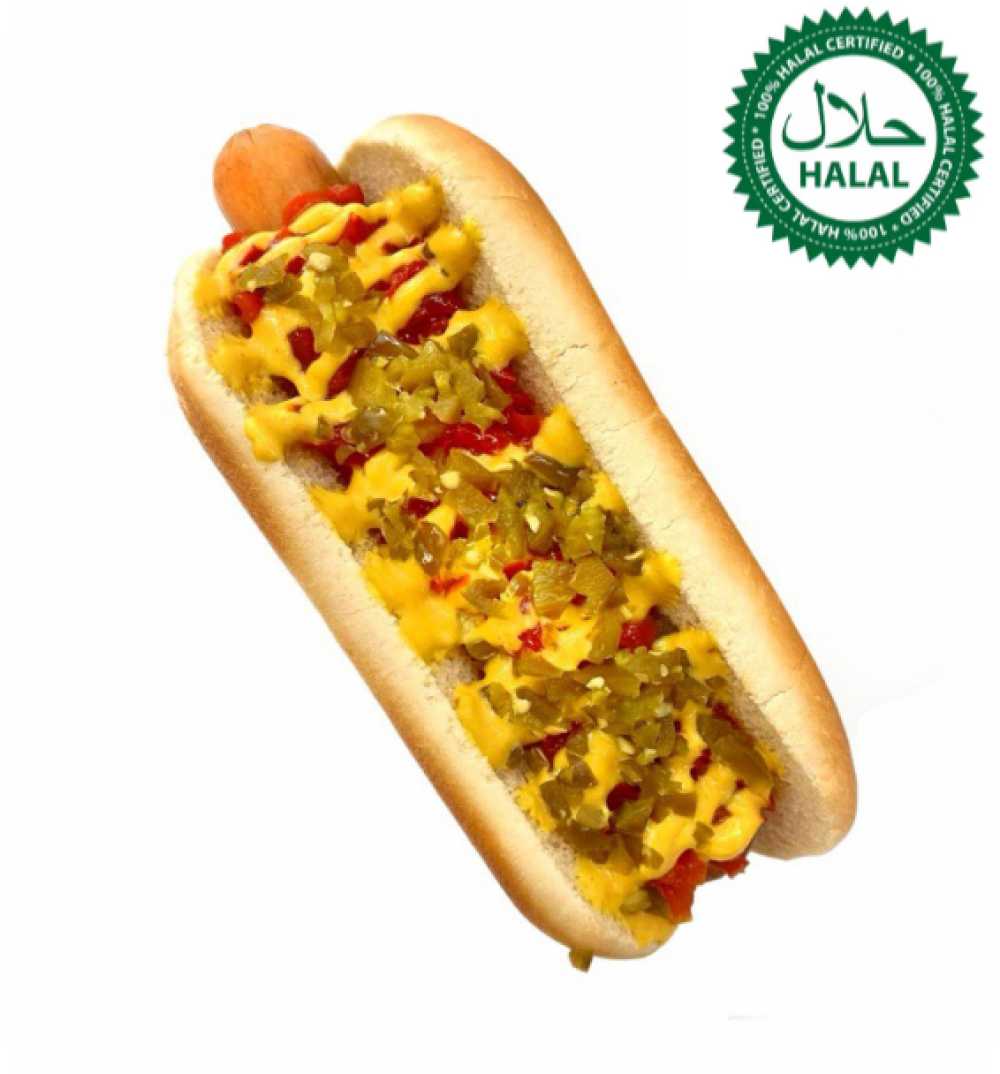 Булка для хот-дога,Сосиска Говяжья,Соус горчичный,Кетчуп,Халапеньо,Конфитюр из болгар.перца.