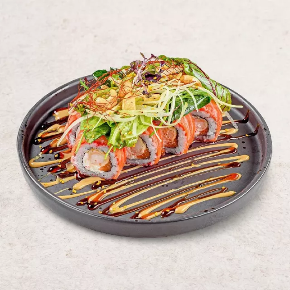 Лосось, сыр, креветка темпура, тобико, микс салата, огурец, кешью, нити чили, кунжут, соусы: сливочный унаги, унаги