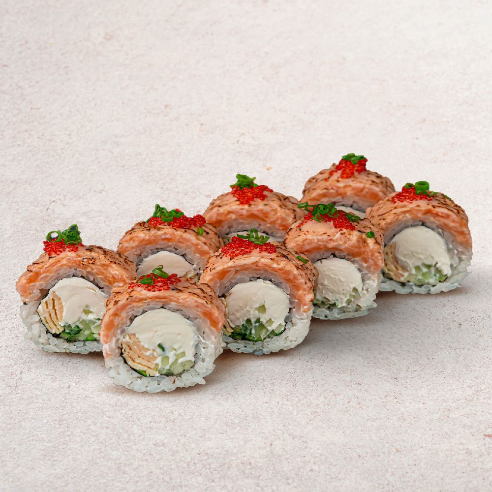 Рис, нори, лосось, сыр, омлет, огурец, масаго, лук зелёный, соусы: спайси, манго тай