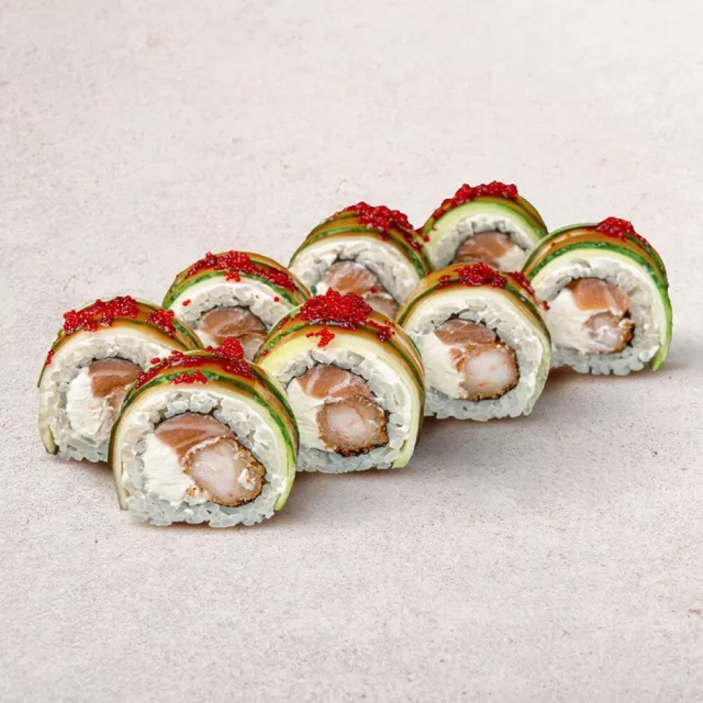 Рис, нори, лосось, креветка темпура, огурец, сыр, масаго, соус унаги