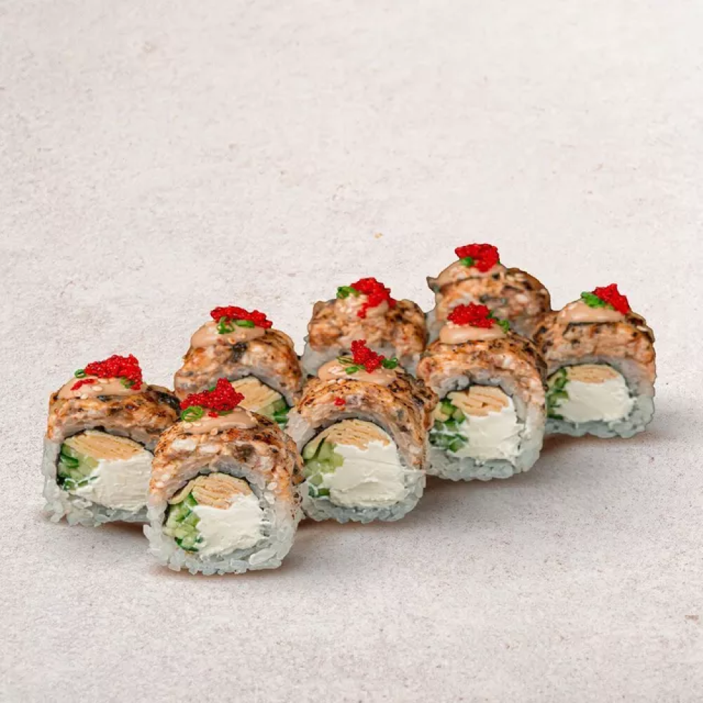 Рис, нори, угорь, сыр, омлет, огурец, масаго, лук зелёный, соусы: спайси, сливочный унаги