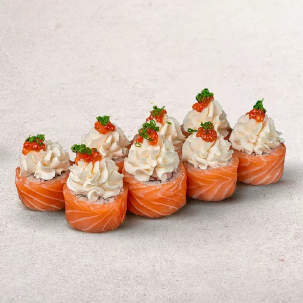 Рис, нори, лосось, краб-крем, икра лосося, сыр, огурец, лук зелёный