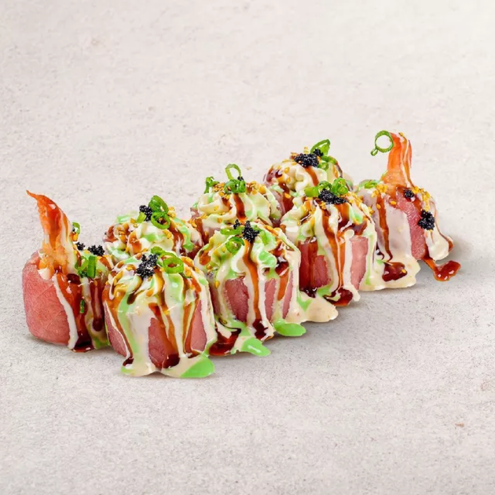 Рис, нори, тунец, креветка темпура, сыр, огурец, тобико, соус спайси, соус васаби, кунжут, лук зелёный