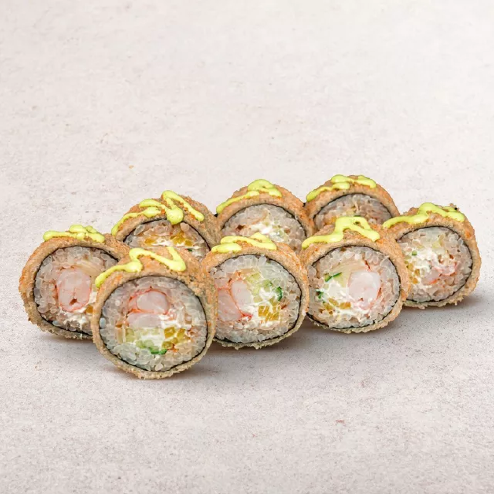 Рис, нори, креветка темпура, огурец, такуан, сыр, соус васаби