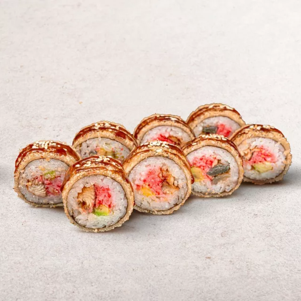 Рис, нори, угорь, краб-крем, авокадо, соус унаги, кунжут