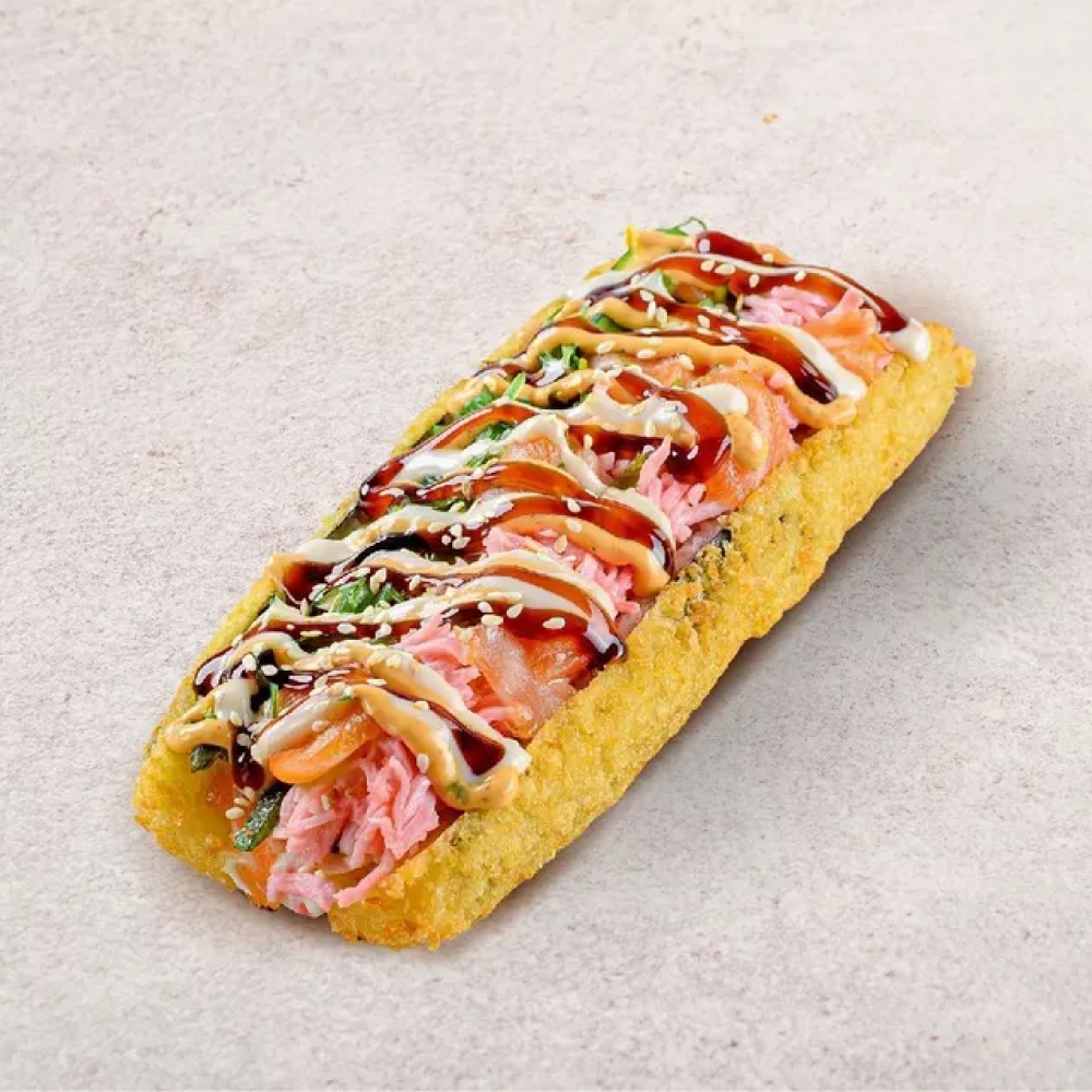 Рис, нори, сыр, лосось, краб крем, огурцы, чука, кунжут, соусы: спайси, унаги