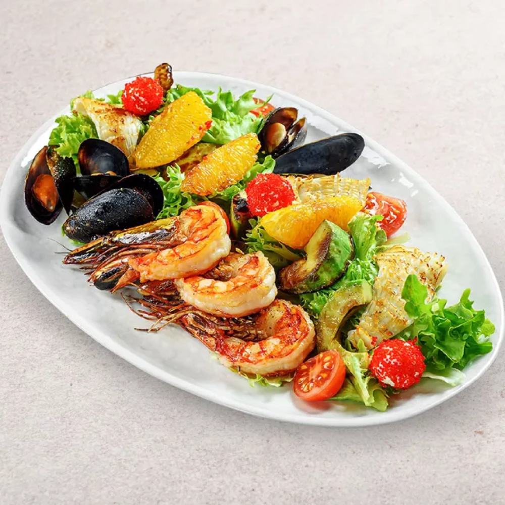 Креветки, мидии, кальмары, авокадо, черри, апельсин, микс салата, сыр сливочный, масаго, соусы: лимонно-цитрусовый, терияки