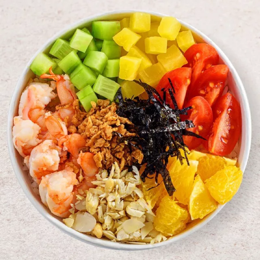 Креветки, огурцы, такуан, черри, апельсин, хлопья миндаля, кешью, лук криспи, нори, соусы: ореховый, манго-чилиКреветки, огурцы, такуан, черри, лук криспи, апельсин, хлопья миндаля, кешью, нори, соусы: ореховый, манго-чили