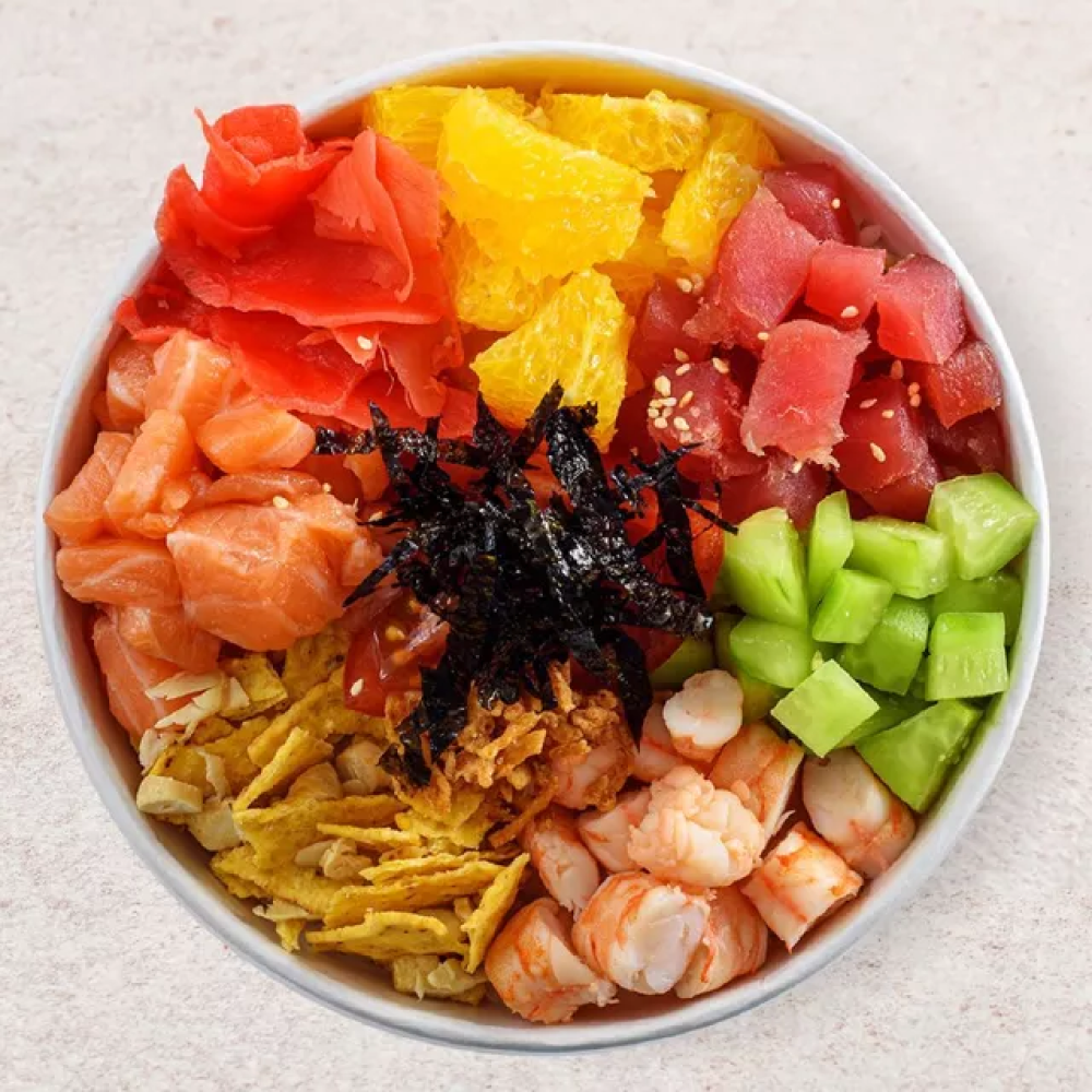 Лосось, тунец, креветки, огурцы, апельсин, черри, начос, хлопья миндаля, имбирь, нори, лук криспи, кунжут, соусы: васаби, унаги, спайси