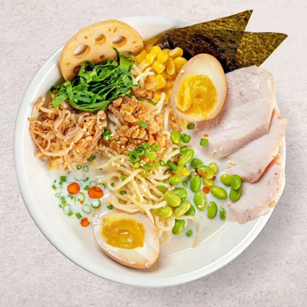 Курица, лапша, кукуруза, шпинат, ростки соевые, эдамаме, лук криспи, лук зеленый, нори, масло чили, маринованные: лотос, яйцо