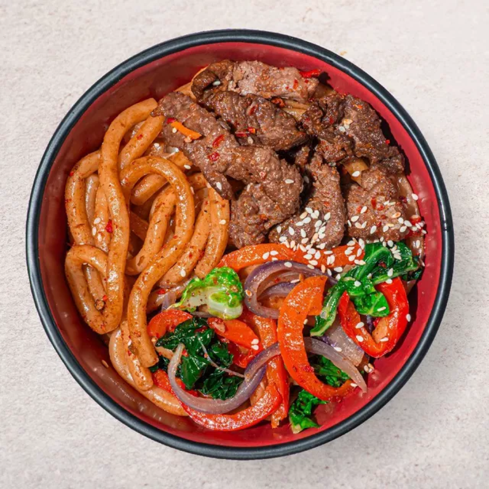 Говядина, удон, морковь, перец болгарский, лук репчатый, кабачки, шампиньоны, имбирь, чеснок, кунжут, лук зеленый, соус Азия