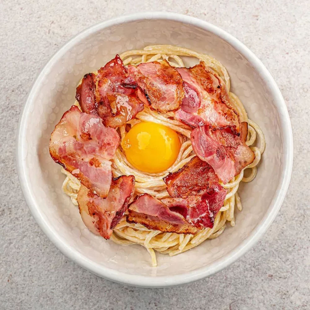 Лапша, сливочный соус, бекон, яичный желток, пармезан