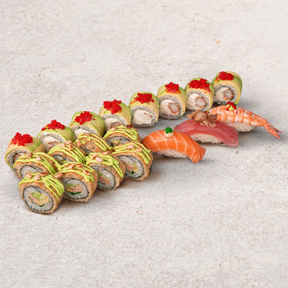 Кога, велл дан салмон, суши лосось 1шт, суши тунец 1шт, суши креветка 1шт