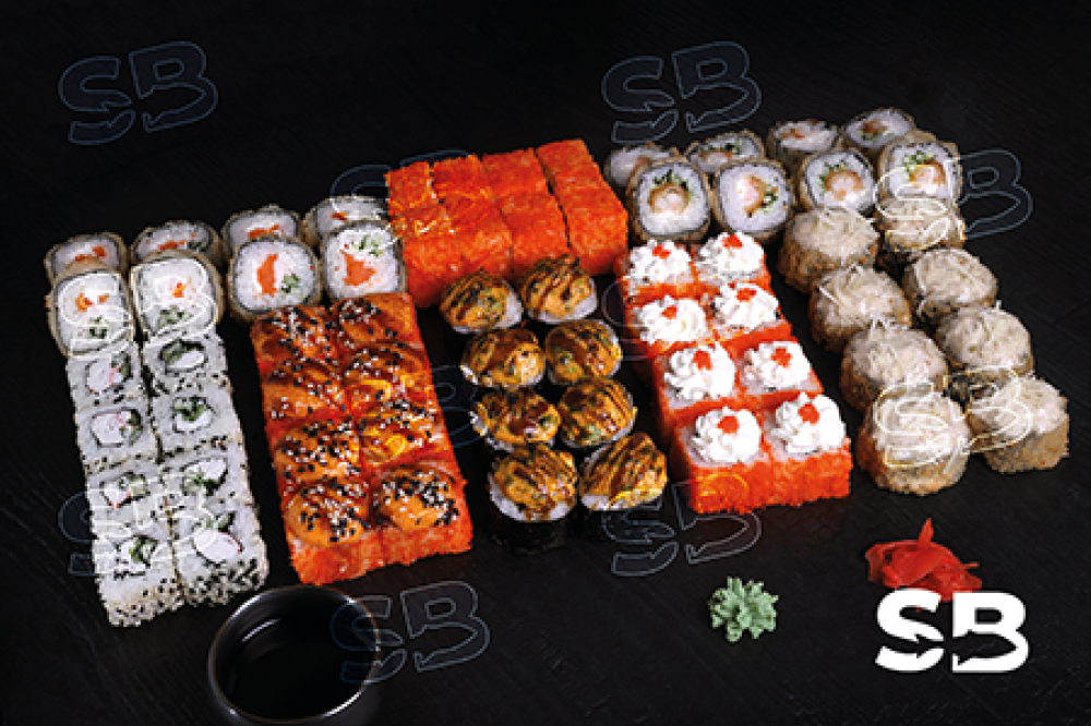 (64 шт) Чикен парма, Ролл Том ям, Сливочная Калифорния, Калифорния в кунжуте, Ролл запеченный с мидиями, Самурай, Тануки , Эдо.