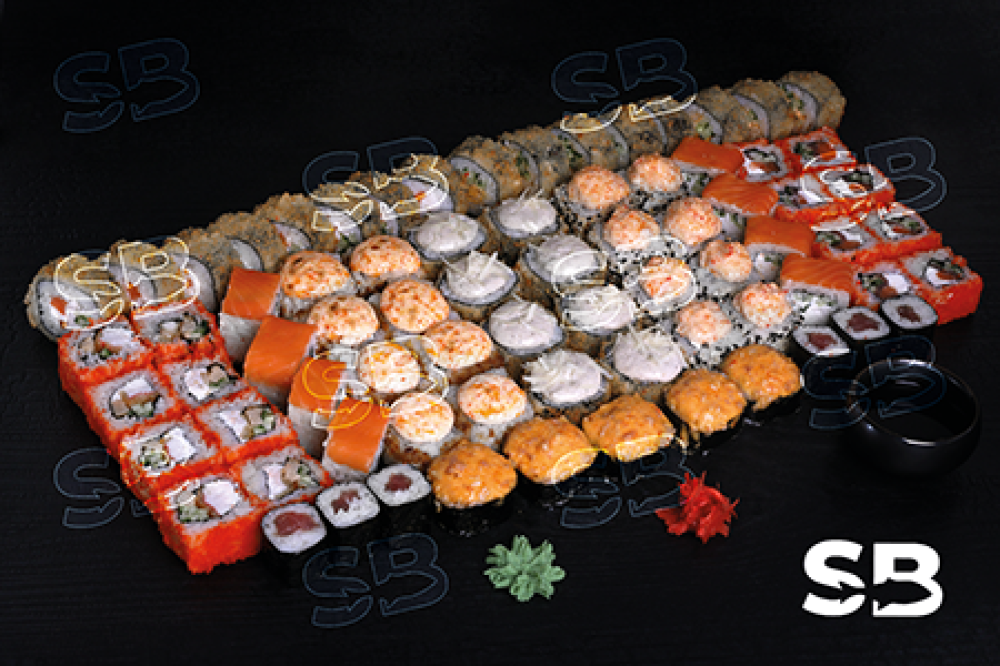 (75 шт) Чикен парма, Эби-туна, Калифорния запеченная в кунжуте, Бангкок, Чиз бекон, Филадельфия лайт, Тамаго краб, Эдо, Ролл тунец, Самурай.