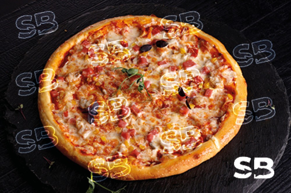 Куриное филе, ветчина, моцарелла, кукуруза, соус томатный.