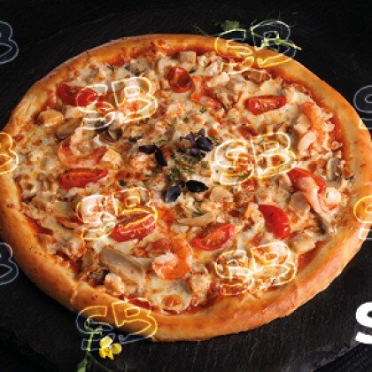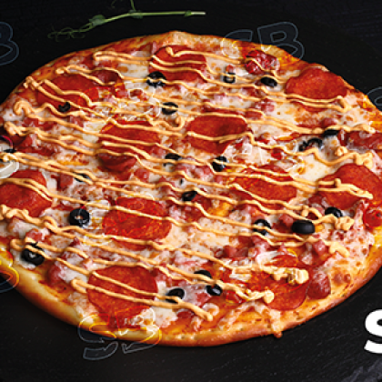 Говядина, куриное филе, ветчина, моцарелла, томаты, соус томатный.