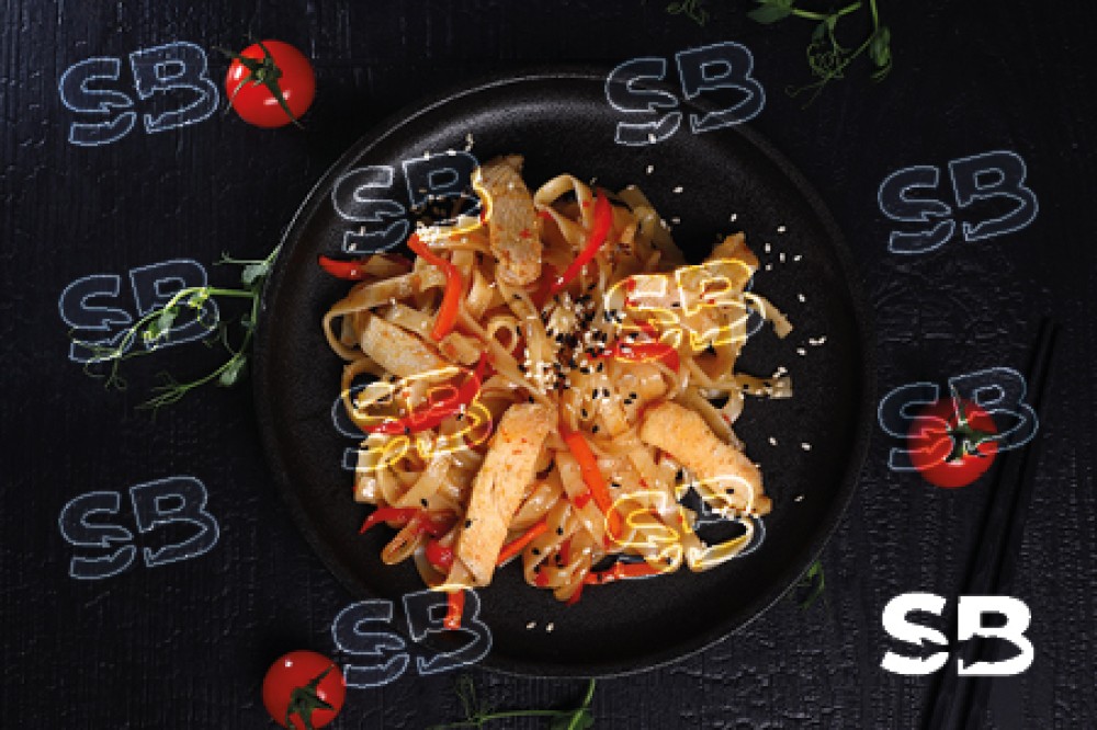 Лапша удон, куриное филе, сладкий перец, пекинская капуста, морковь, лук репчатый, соус сладкий чили.