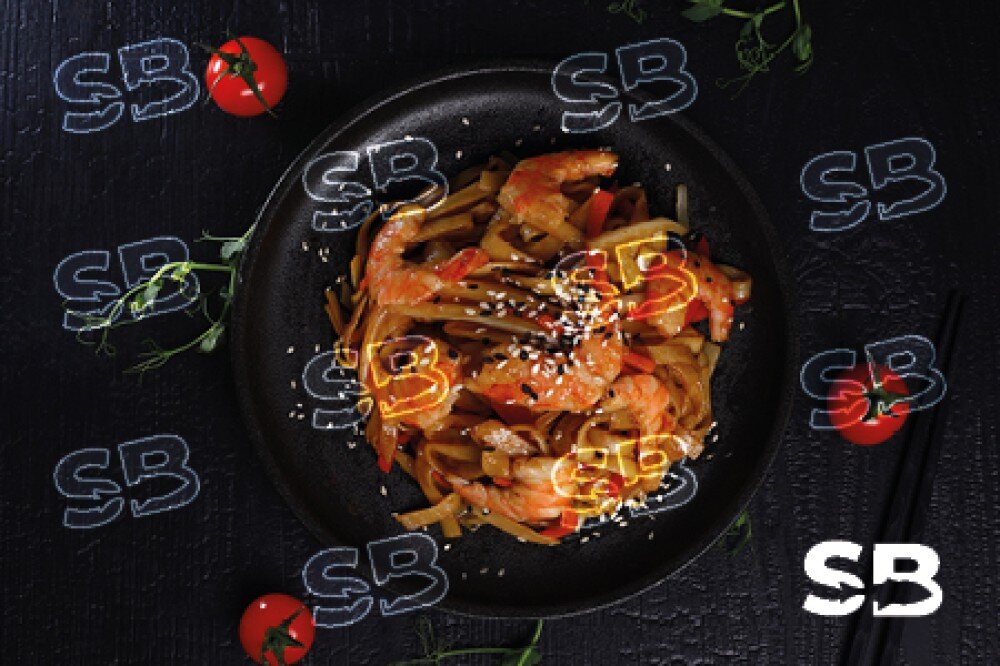 Лапша удон, креветки, сладкий перец, пекинская капуста, морковь, лук репчатый, соус терияки.